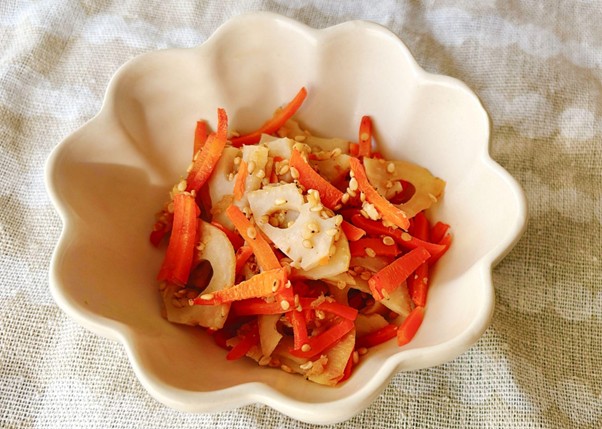 1)れんこんは1cm大の薄切りにして水にさらす。にんじんは1cm長さの千切りにする